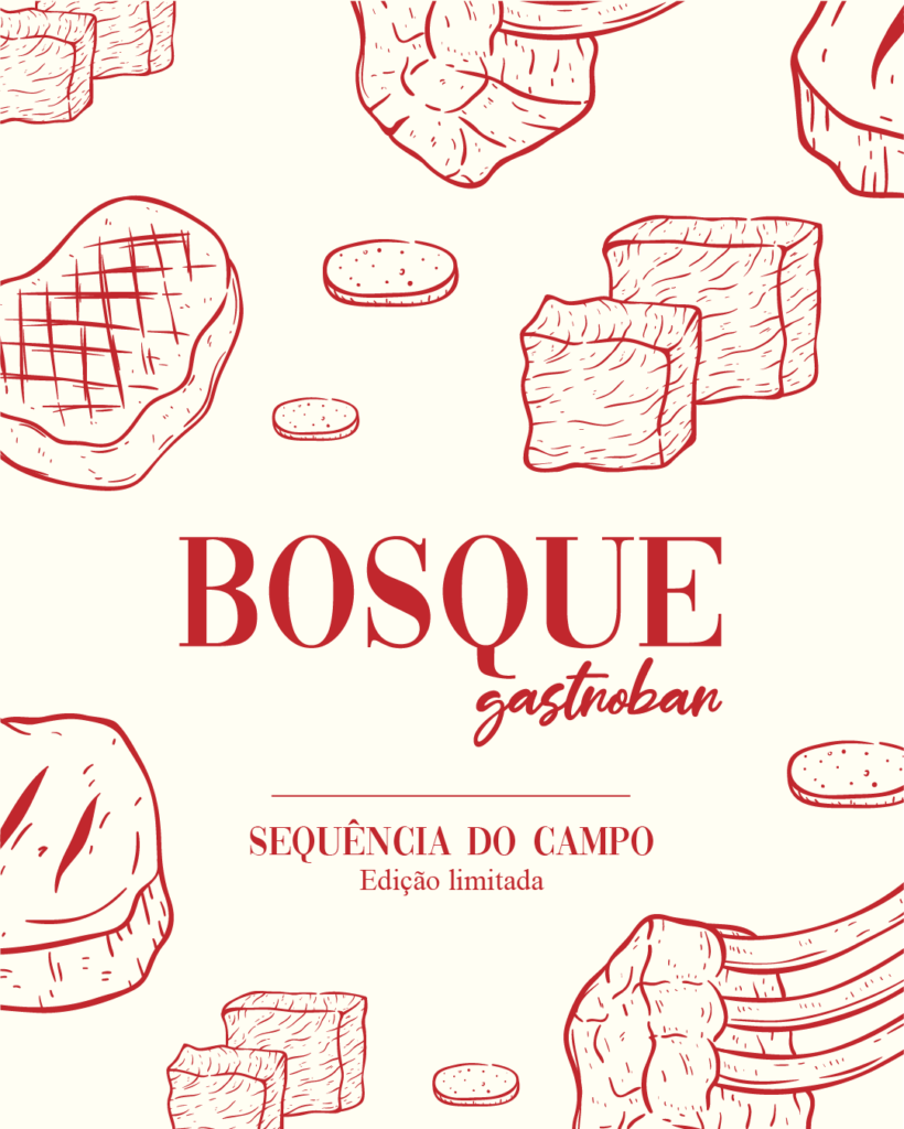 Anúncio para divulgar, em edição limitada, a nova experiência do campo no jantar do Bosque Gastrobar. Uma sequência completa de pratos com carnes e sobremesa.