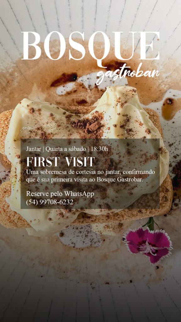 Anúncio para fomentar o jantar divulgando sobremesa de cortesia para reservas de primeira visita no Bosque Gastrobar.