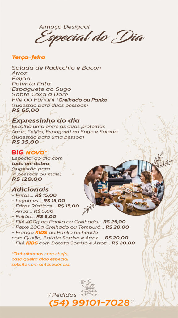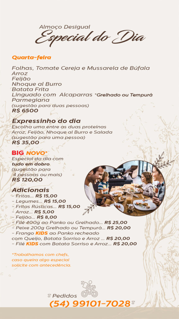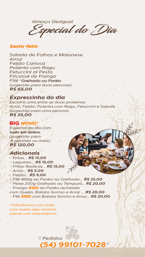 Confira o cardápio semanal Big A da Casa do Bosque e faça seu pedido.
