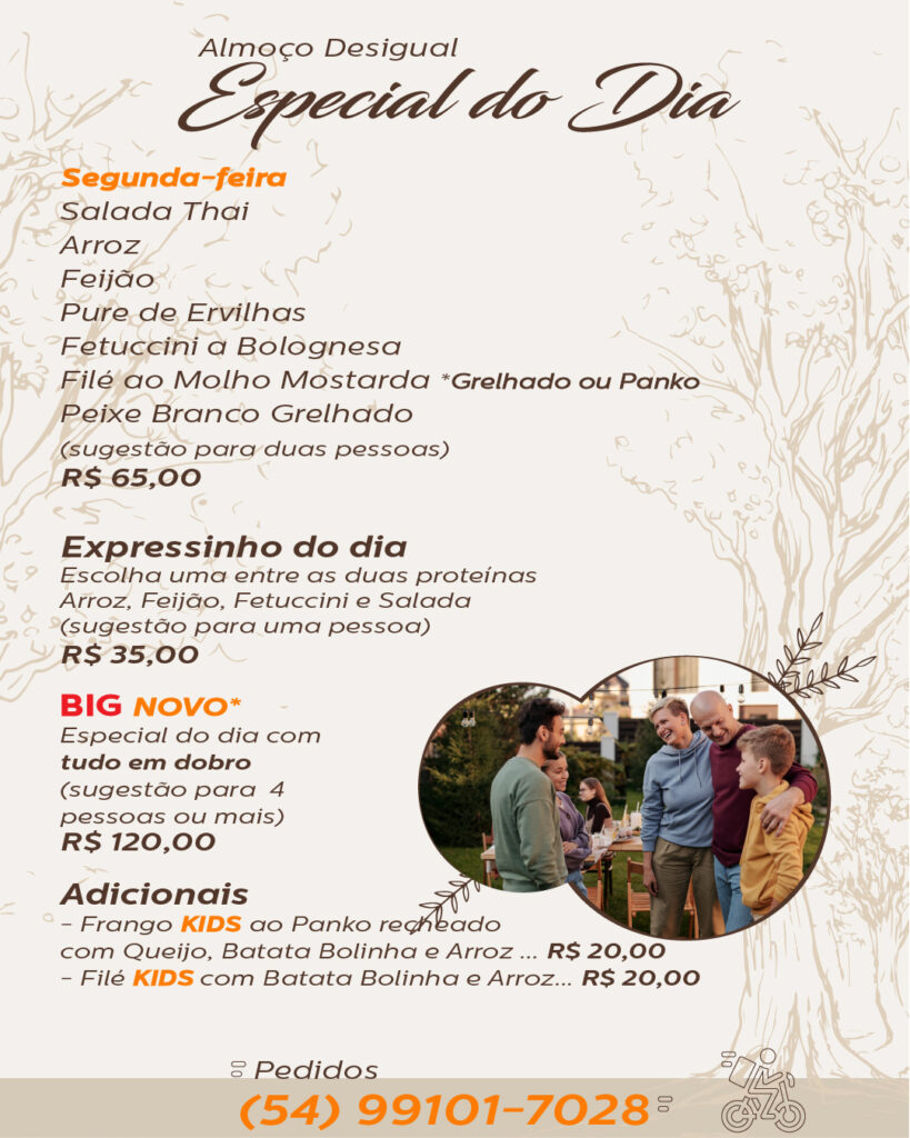 Cardápio atualizado de quarta-feira A da Casa do Bosque
