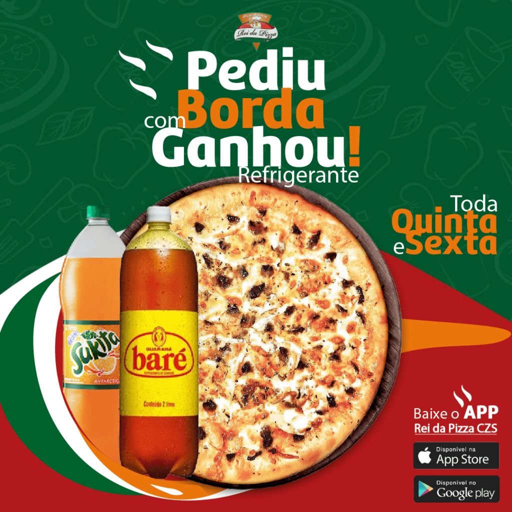 Peça uma #pizza 🍕 com BORDA pelo APP #reidapizzaczs 🤳 e GANHE um refrigerante 2L 🙌 👇