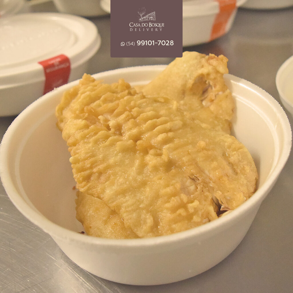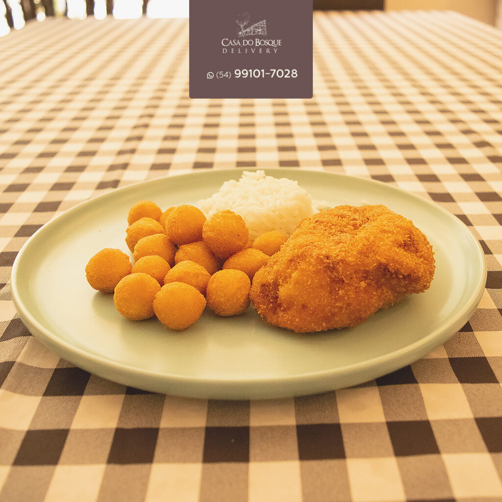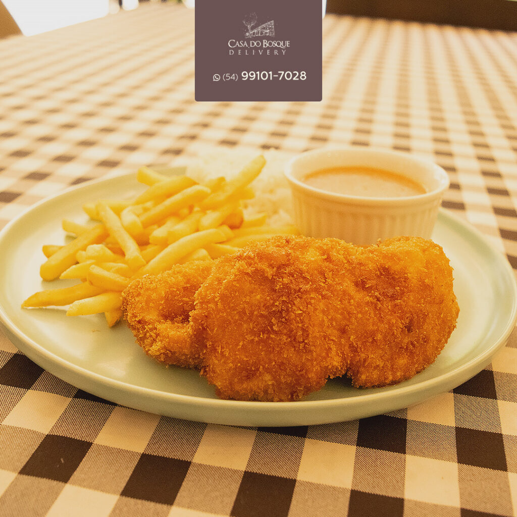 Frango ao Panko com Queijo, Molho Vermelho, Arroz e Fritas.✨